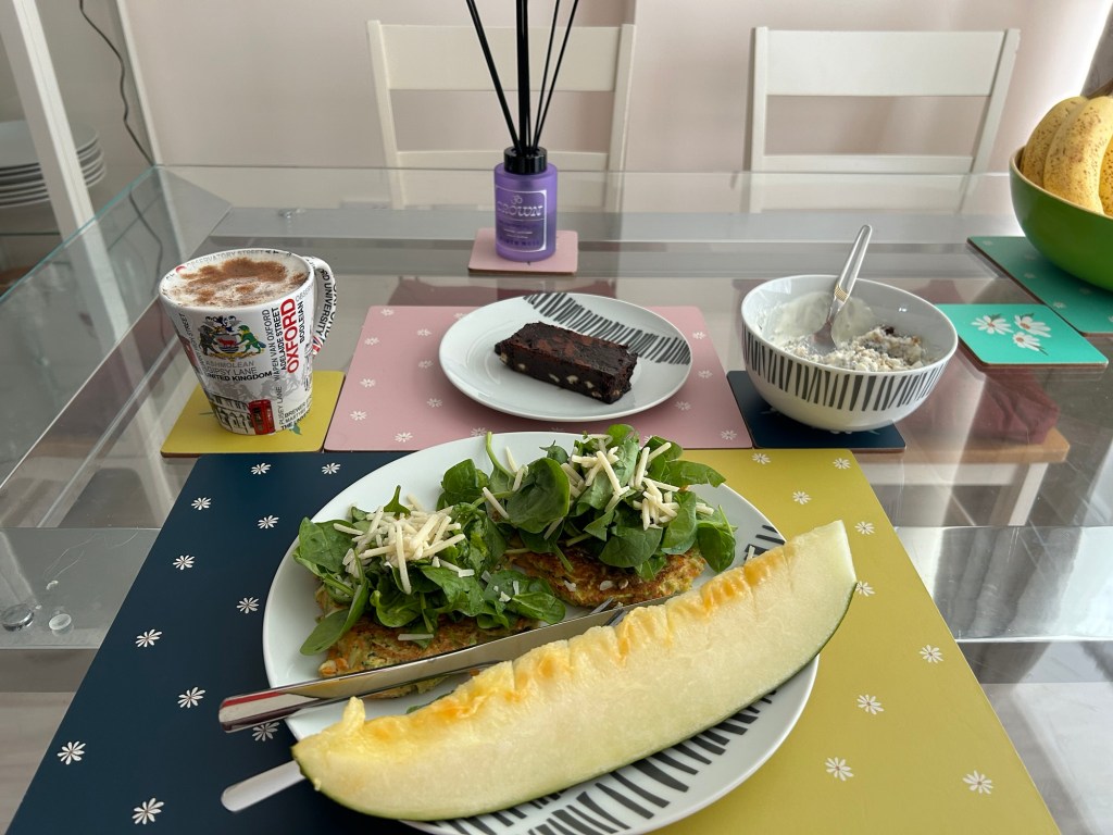 Ok, I’ll stick to the question and just say one habit: cooking. And if it’s good and healthy on top of that, then all the better. But, well, I always cook good and healthy food. What’s in the picture? My breakfast today. Call it breakfast, brunch, almorzaret (valencian term to call brunch, but the Valencians that will read this, they will say a different thing 🙃) or whatever you like. Homemade Chai Latte, brownie (this was bought, but it’s delicious anyway 😎), yoghurt & cottage cheese with chia seeds and cereals, melon, and carrot and courgette pancakes with spinach and parmesan on top. I thought I’d make it through the night without eating, but talking about this is making me hungry…..