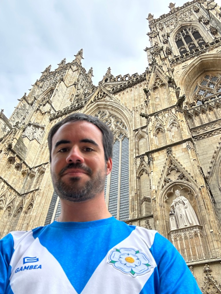Tenía bajo la chaqueta y el jersey una camiseta que los amigos de La Media Inglesa habían diseñado en uno de sus magníficos vídeos (altamente recomendable, ¿aún no los conoces? ¡Suscríbete! Y dale a la campanera para saber cuando publican un nuevo vídeo). Imagino que toda la gente que se ve en la imagen de arriba se me quedaría mirando, pero aún así, la foto con la equipación del Yorkshire Athletic debía ser inmortalizada. Así que sin pensarlo un instante, me despojé de todo abrigo y fui a ello: